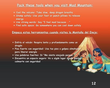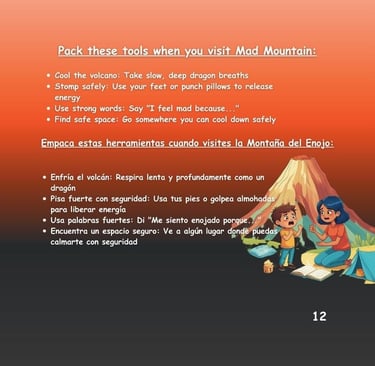 For each emotional landscape, the guide provides a "travel toolkit" with simple, actionable advice. For example, when visiting the Mad Mountain of anger, children are encouraged to "cool the volcano" with deep breaths and "stomp safely" to release energy. To feel proud, you can "plant your flag" and "thank your helpers".