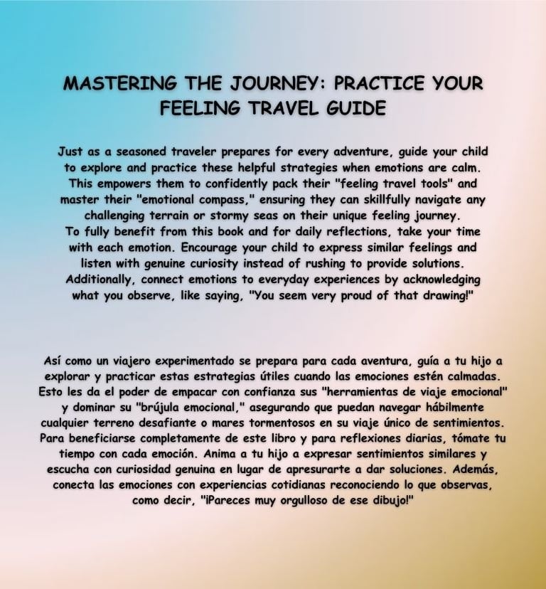 As a parent or caregiver, you are the most important part of your child's emotional journey. That's why "My Feelings Travel Guide" includes a special section with practical tips to help you guide your child, foster open communication, and connect their feelings to everyday life.